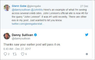 Glenn wrote, "I noticed that some celebrities aren’t ranking anymore for their own names. Their websites used to rank number one in the search results as of early December, but those sites are now either at the bottom of page one or even off of page one."